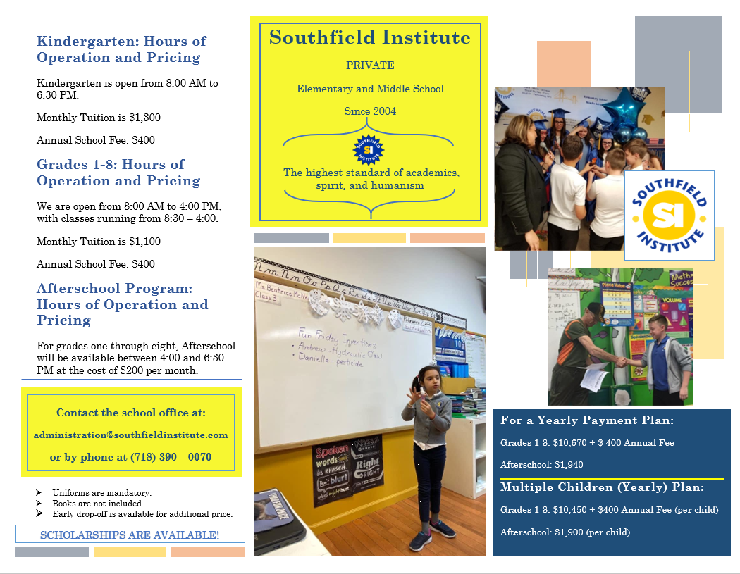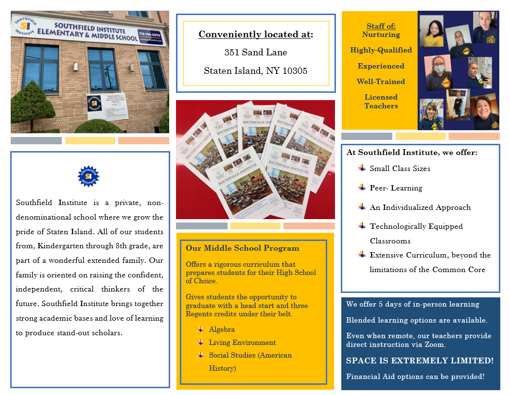 Smiles Around Us Academy/Southfield Institute is a private, non-denominational school where we grow the pride of Staten Island. All our students from Pre-K through 8th grade are part of a wonderful extended family. Our family is oriented on raising confident, independent, critical thinkers of the future. Southfield institute brings together strong academic bases and love of learning to produce stand out scholars.